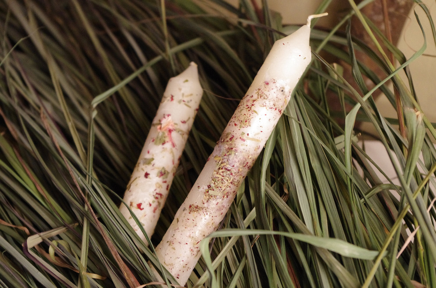 These handmade white beeswax taper candles are lovingly rolled in crushed eucalyptus leaf, rose petal and Christmas tree needle, so the natural fragrance oils of each herb release into the candle. They have no added fragrance oil and douse a Christmastime home with warmth and joy. Not only does it emit a warm, unparalleled glow, but it also releases negative ions that help purify the air, promoting a healthier living space without the harsh chemicals of store-bought candles. These candles drip, so be sure to place under a fireproof dish to catch wax spillage and leaf debris. Choose from a set of tall, 7" tapers or small, 5" tapers.